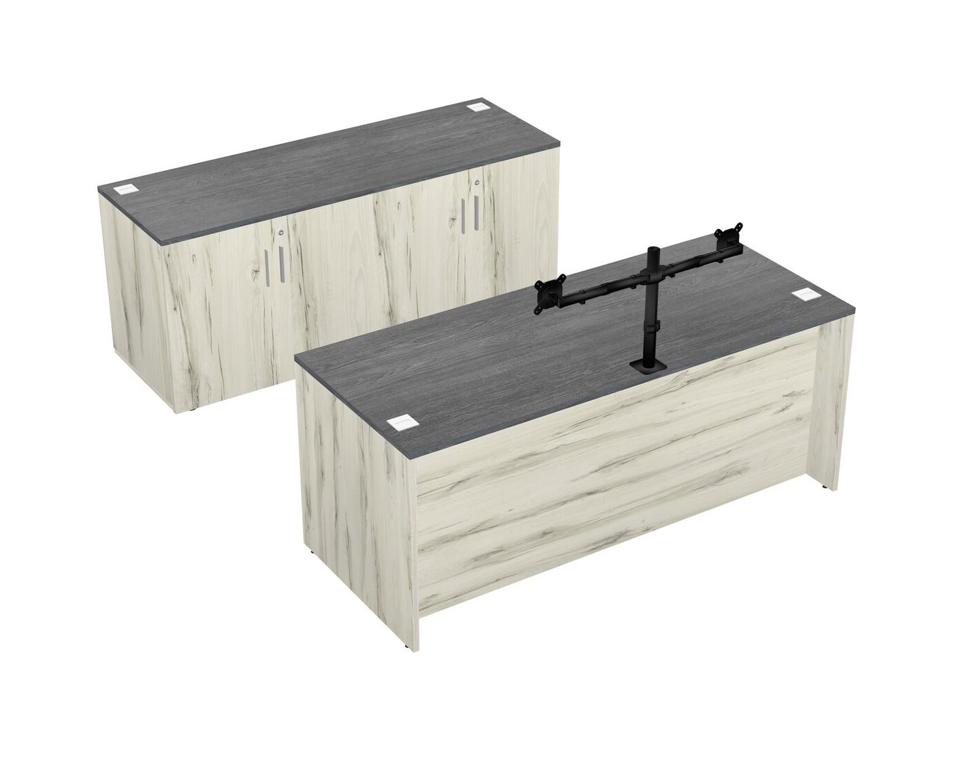 Grey Office Parallel Desk With Storage Cabinet + Wooden Mobile Drawers + Monitor Arm (double Arms)