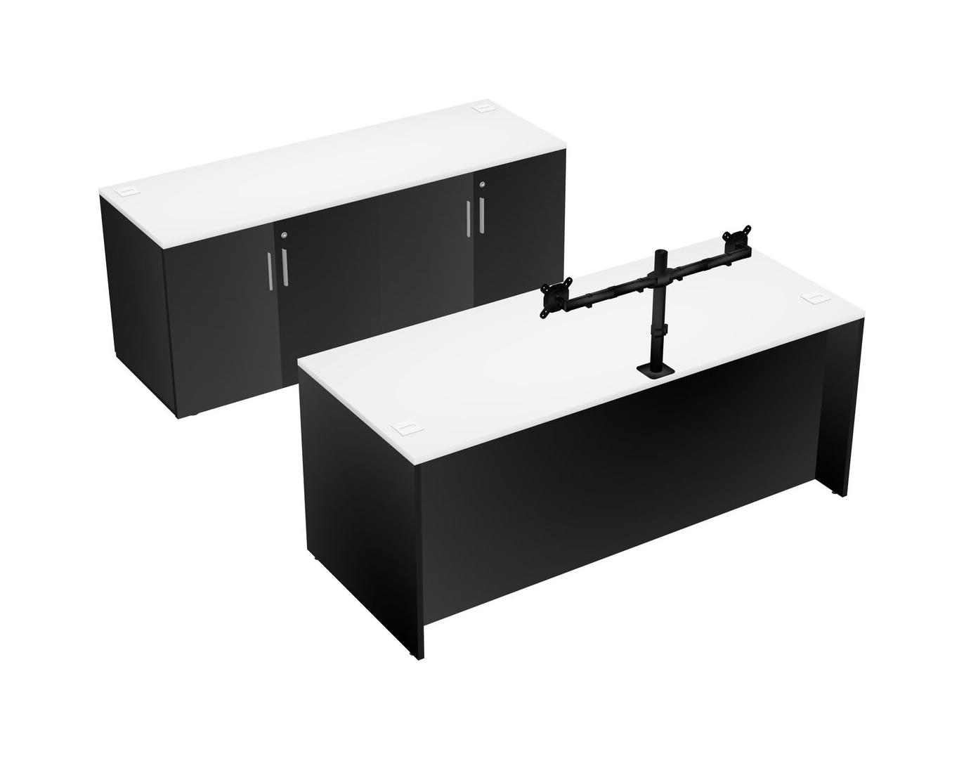 White Office Parallel Desk With Storage Cabinet + Wooden Mobile Drawers + Monitor Arm (double Arms)