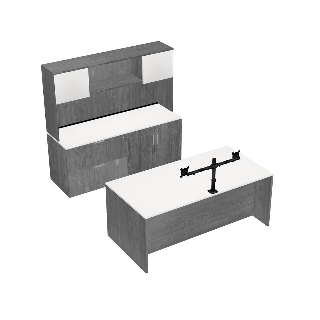 White Office Parallel Desk With Lateral Storage Combo + Hutch + Monitor Arm (double Arms)