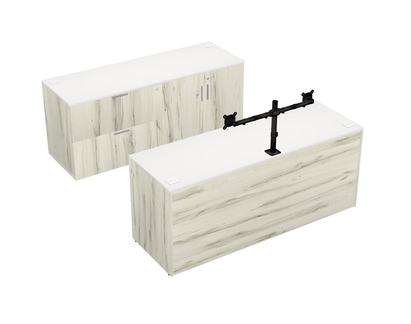 White Office Parallel Desk With Lateral Storage Combo + Wooden Mobile Drawers + Monitor Arm (double Arms)