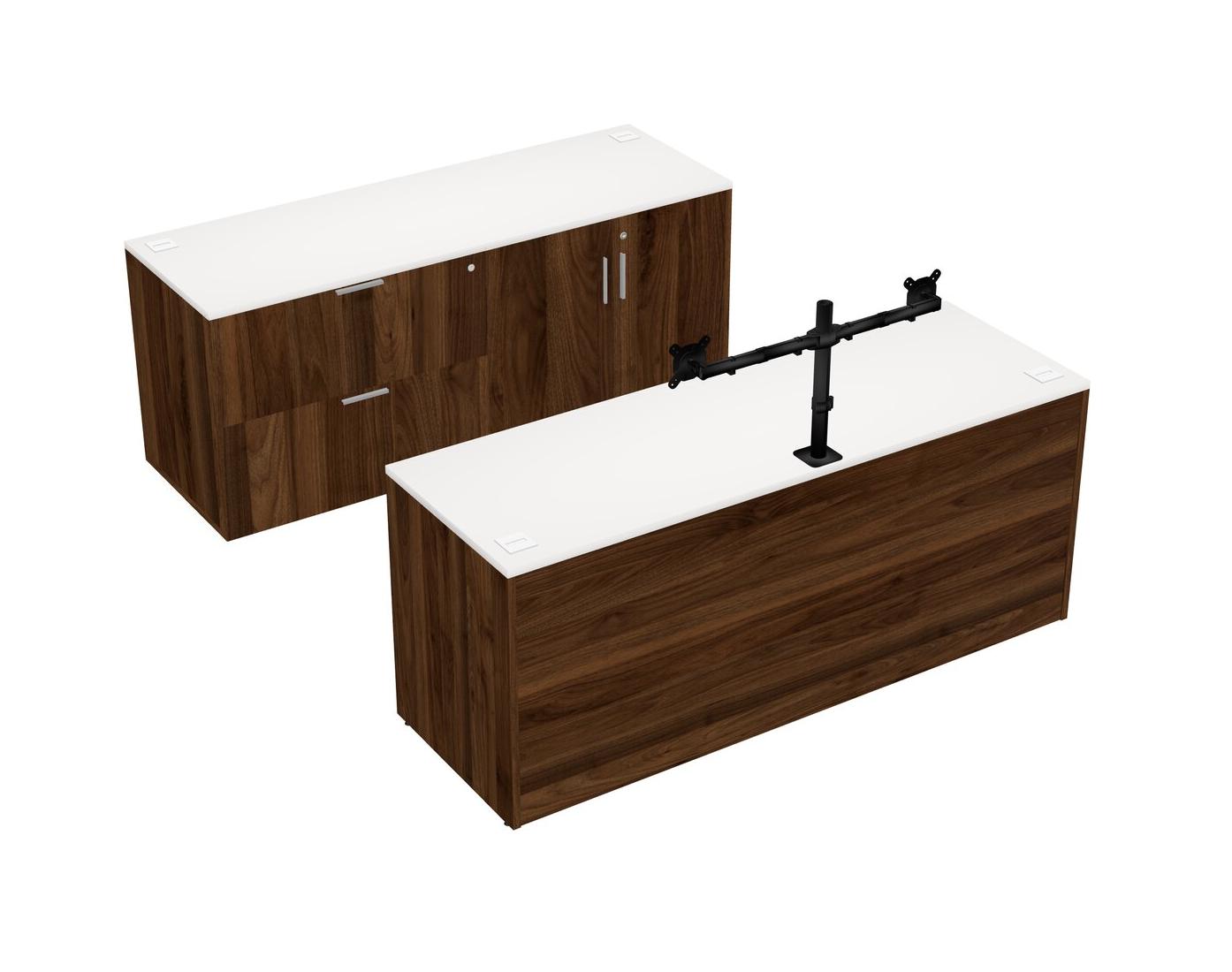 White Office Parallel Desk With Lateral Storage Combo + Wooden Mobile Drawers + Monitor Arm (double Arms)