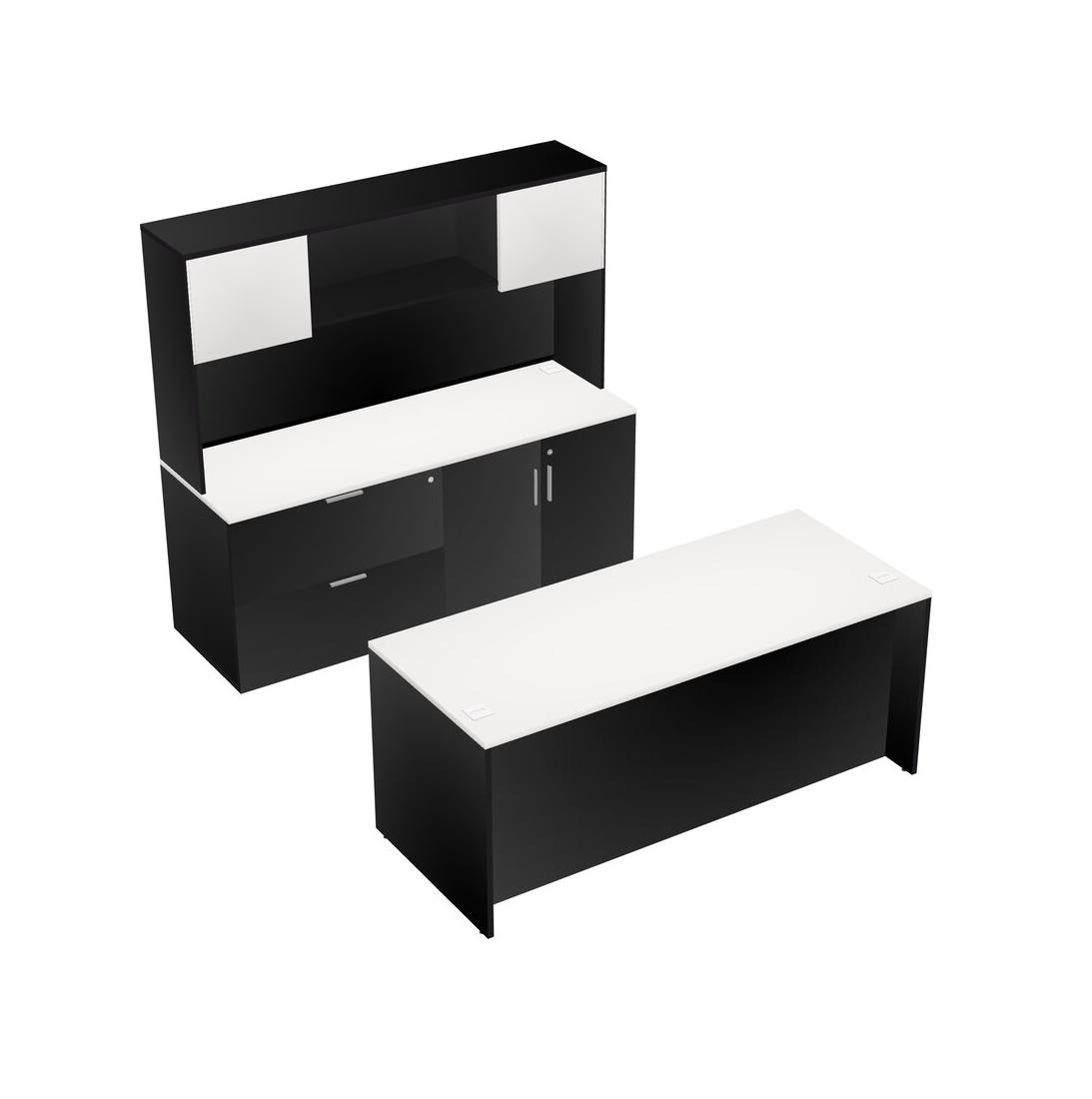 White Office Parallel Desk With Lateral Storage Combo + Wooden Mobile Drawers + Hutch