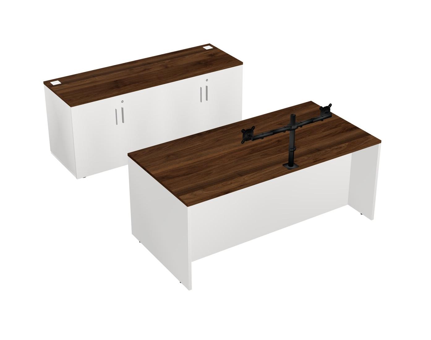 Columbia Walnut Office Parallel Desk With Storage Cabinet + Monitor Arm (double Arms)