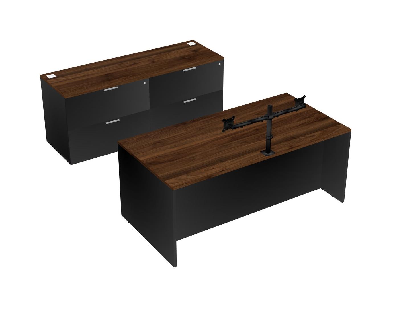 Columbia Walnut Office Parallel Desk With Lateral File Cabinet + Monitor Arm (double Arms)
