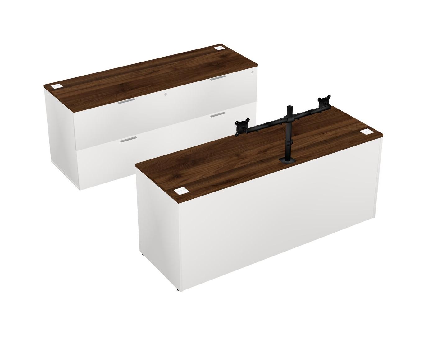 Columbia Walnut Office Parallel Desk With Lateral File Cabinet + Monitor Arm (double Arms)
