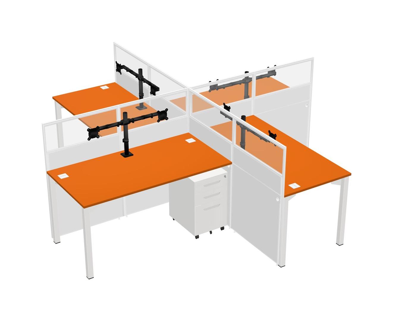 Orange Quad Cubicle Workstations For 4 + White Metal Mobile Drawers + Monitor Arm (double Arms)