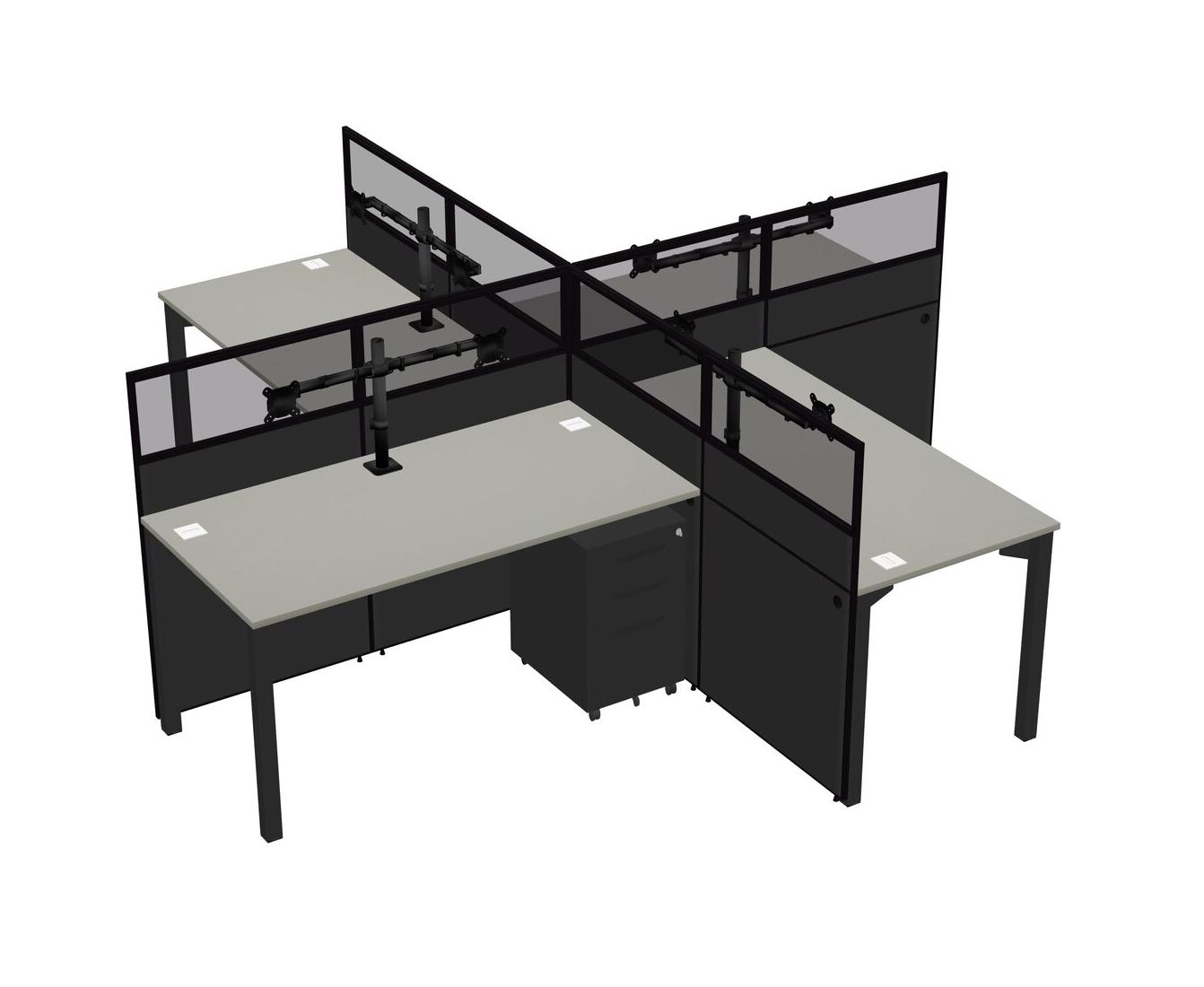 Grey Shadows Quad Cubicle Workstations For 4 + Black Metal Mobile Drawers + Monitor Arm (double Arms)