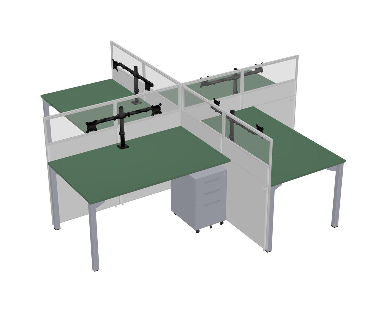 Green Quad Cubicle Workstations For 4 + Grey Metal Mobile Drawers + Monitor Arm (double Arms)