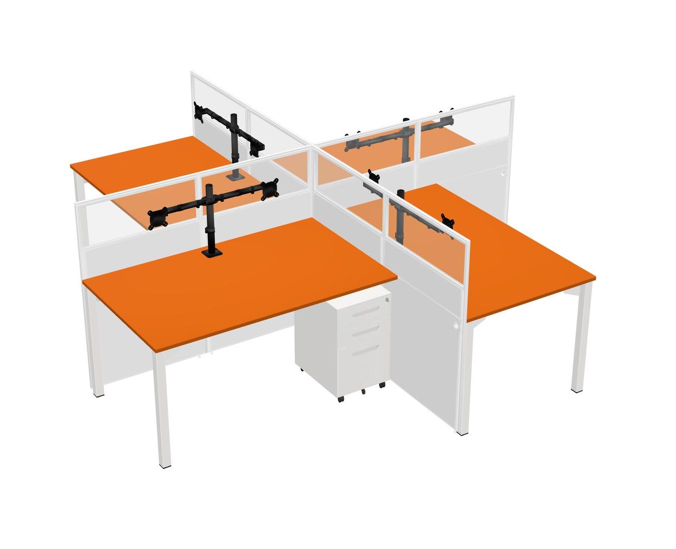 Orange Quad Cubicle Workstations For 4 + White Metal Mobile Drawers + Monitor Arm (double Arms)