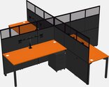 Orange Quad Cubicle Workstations For 4 + Black Metal Mobile Drawers + Monitor Arm (double Arms)