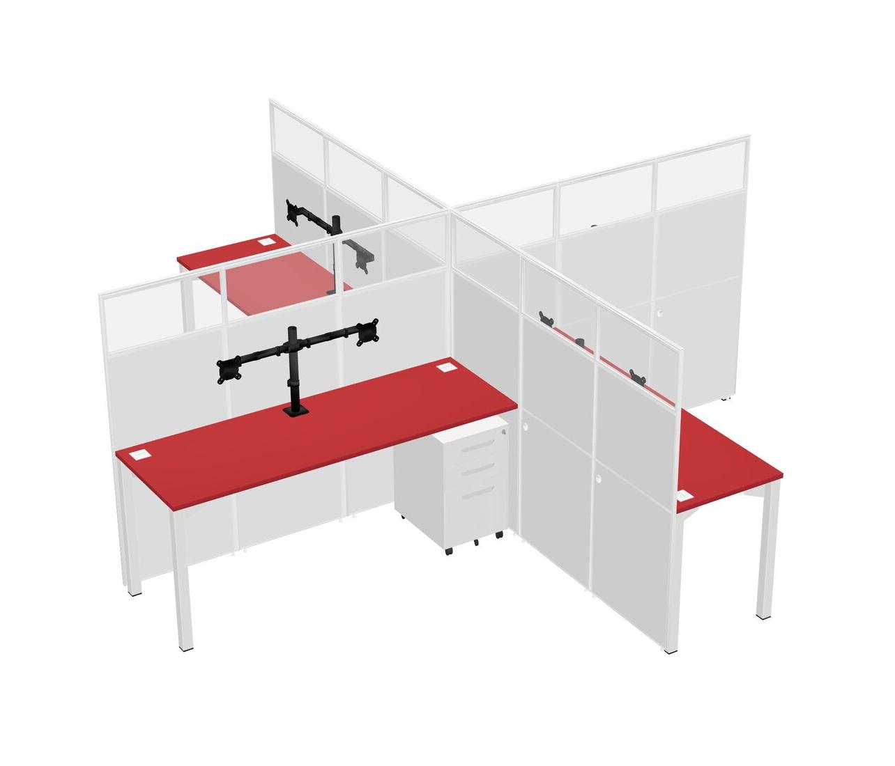 Prism Red Quad Cubicle Workstations For 4 + White Metal Mobile Drawers + Monitor Arm (double Arms)