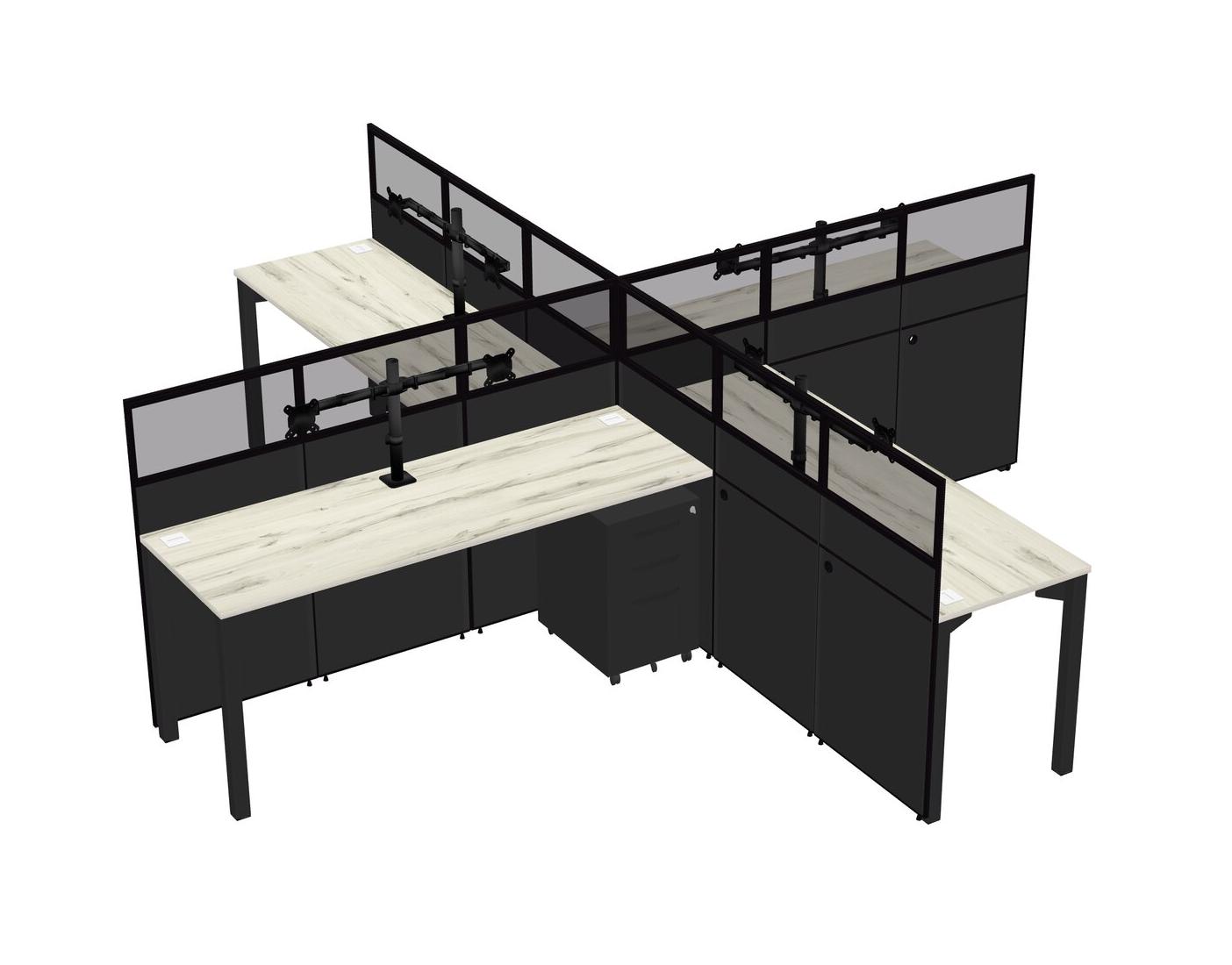 Heinne Holz Quad Cubicle Workstations For 4 + Black Metal Mobile Drawers + Monitor Arm (double Arms)