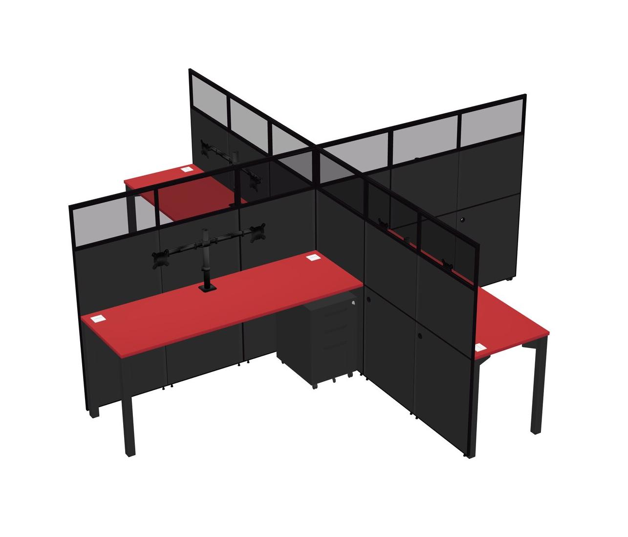 Prism Red Quad Cubicle Workstations For 4 + Black Metal Mobile Drawers + Monitor Arm (double Arms)