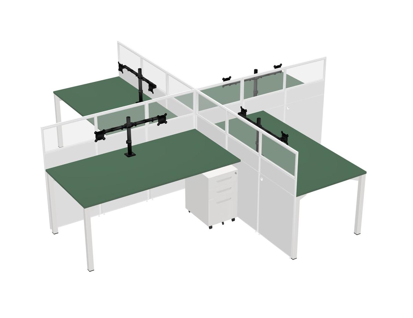 Green Quad Cubicle Workstations For 4 + White Metal Mobile Drawers + Monitor Arm (double Arms)