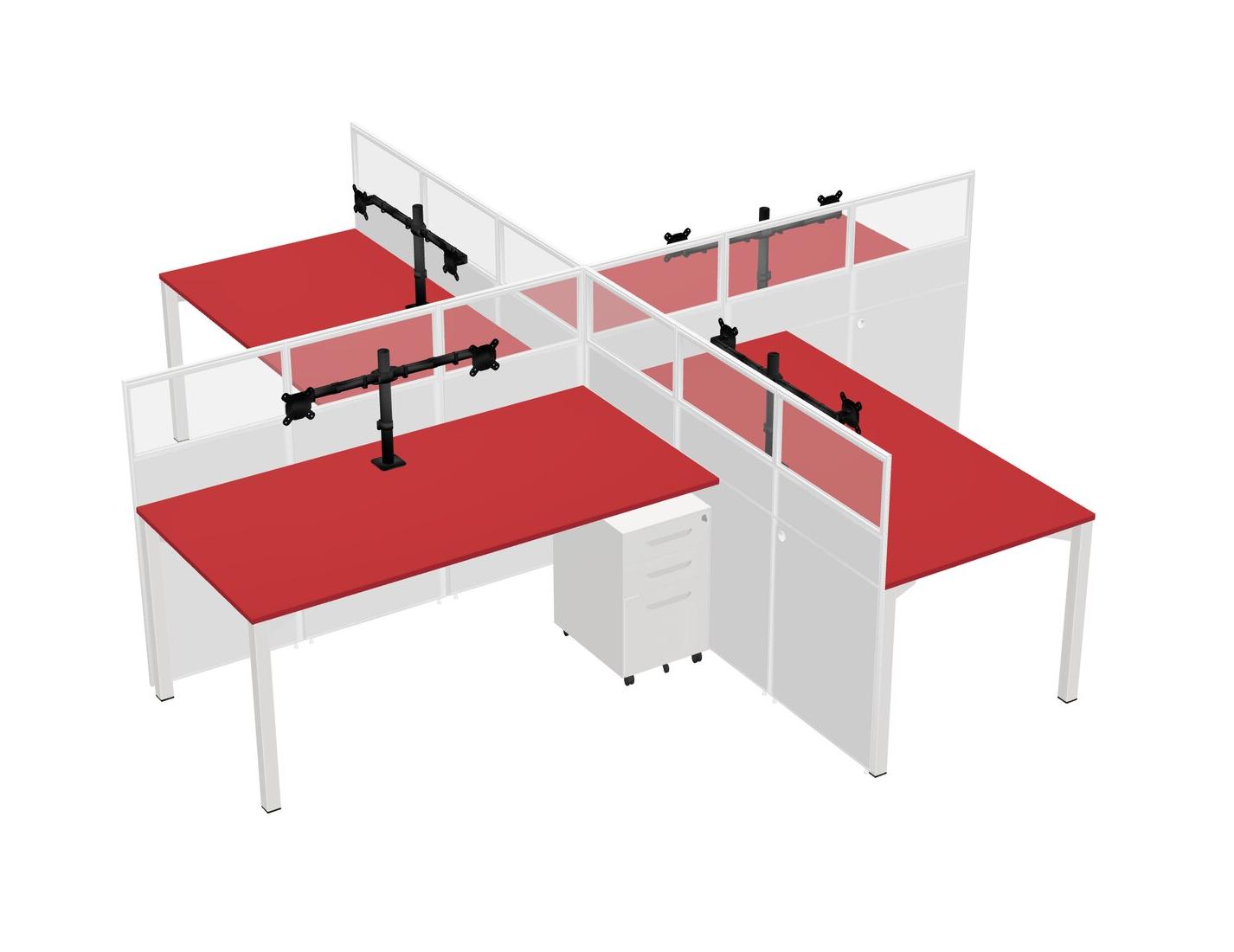 Prism Red Quad Cubicle Workstations For 4 + White Metal Mobile Drawers + Monitor Arm (double Arms)