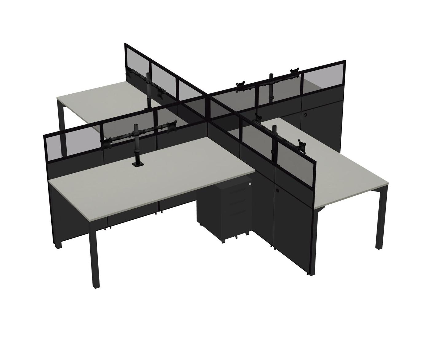 Grey Shadows Quad Cubicle Workstations For 4 + Black Metal Mobile Drawers + Monitor Arm (double Arms)