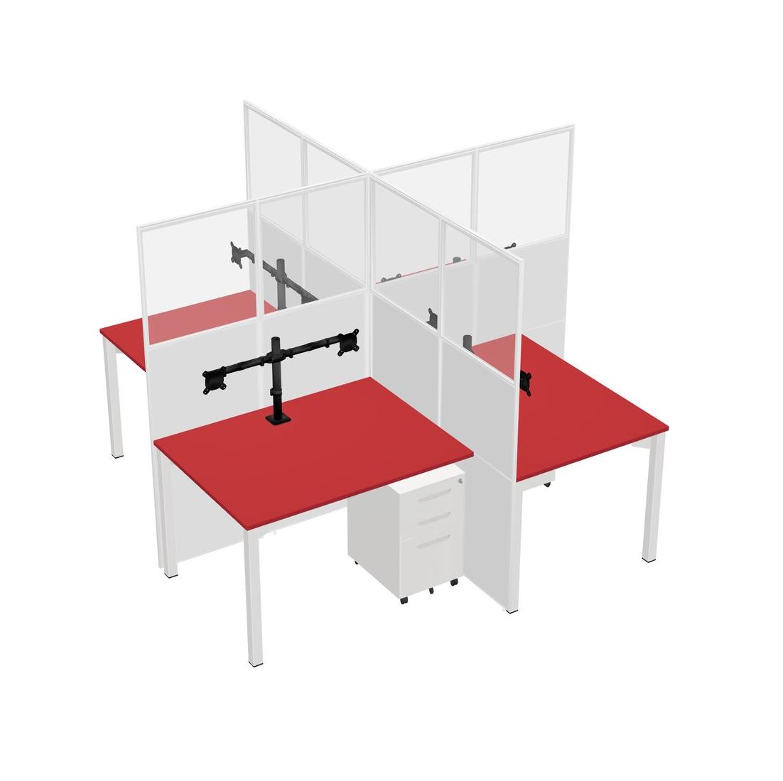 Prism Red Quad Cubicle Workstations For 4 + White Metal Mobile Drawers + Monitor Arm (double Arms)