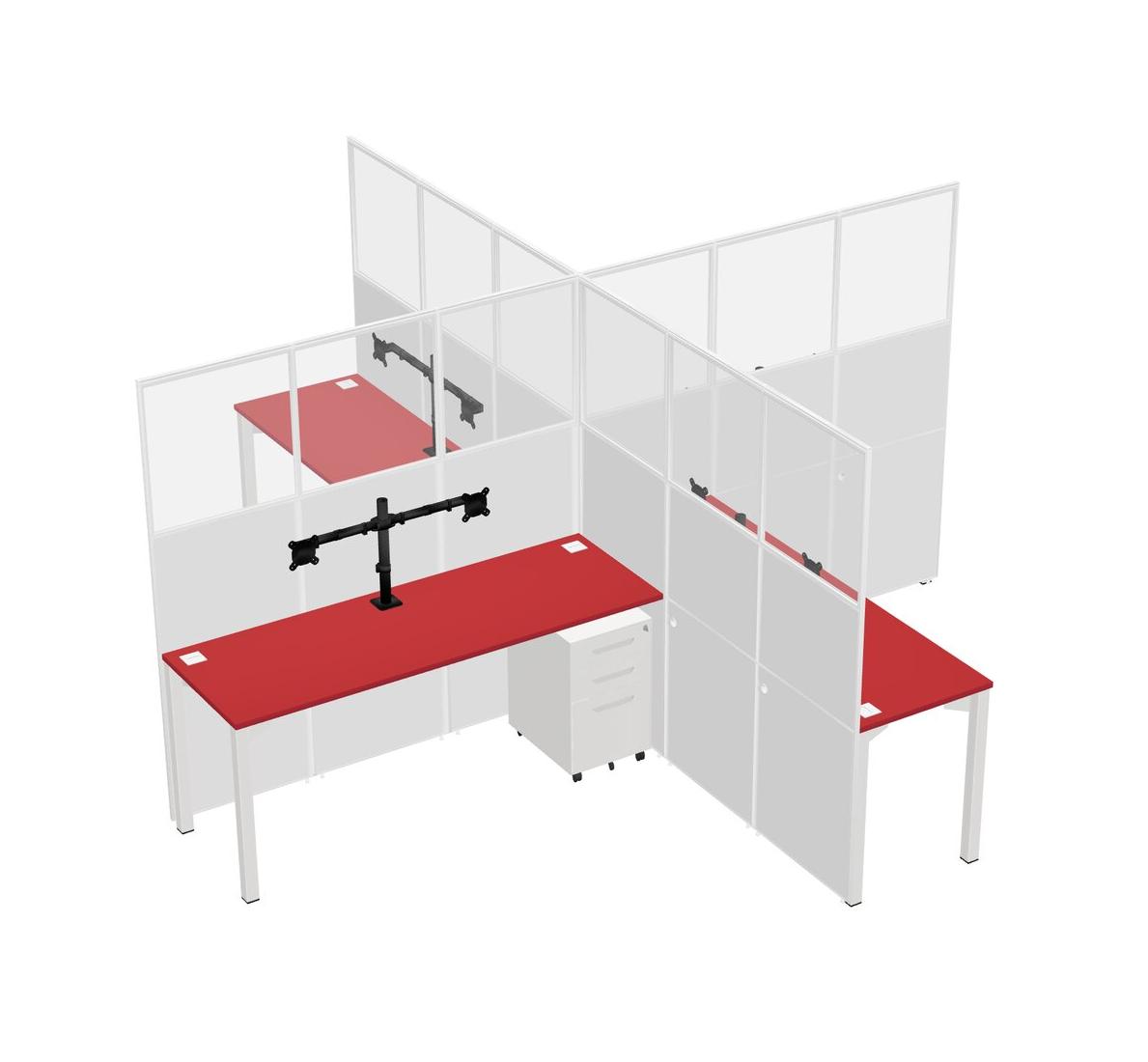 Prism Red Quad Cubicle Workstations For 4 + White Metal Mobile Drawers + Monitor Arm (double Arms)