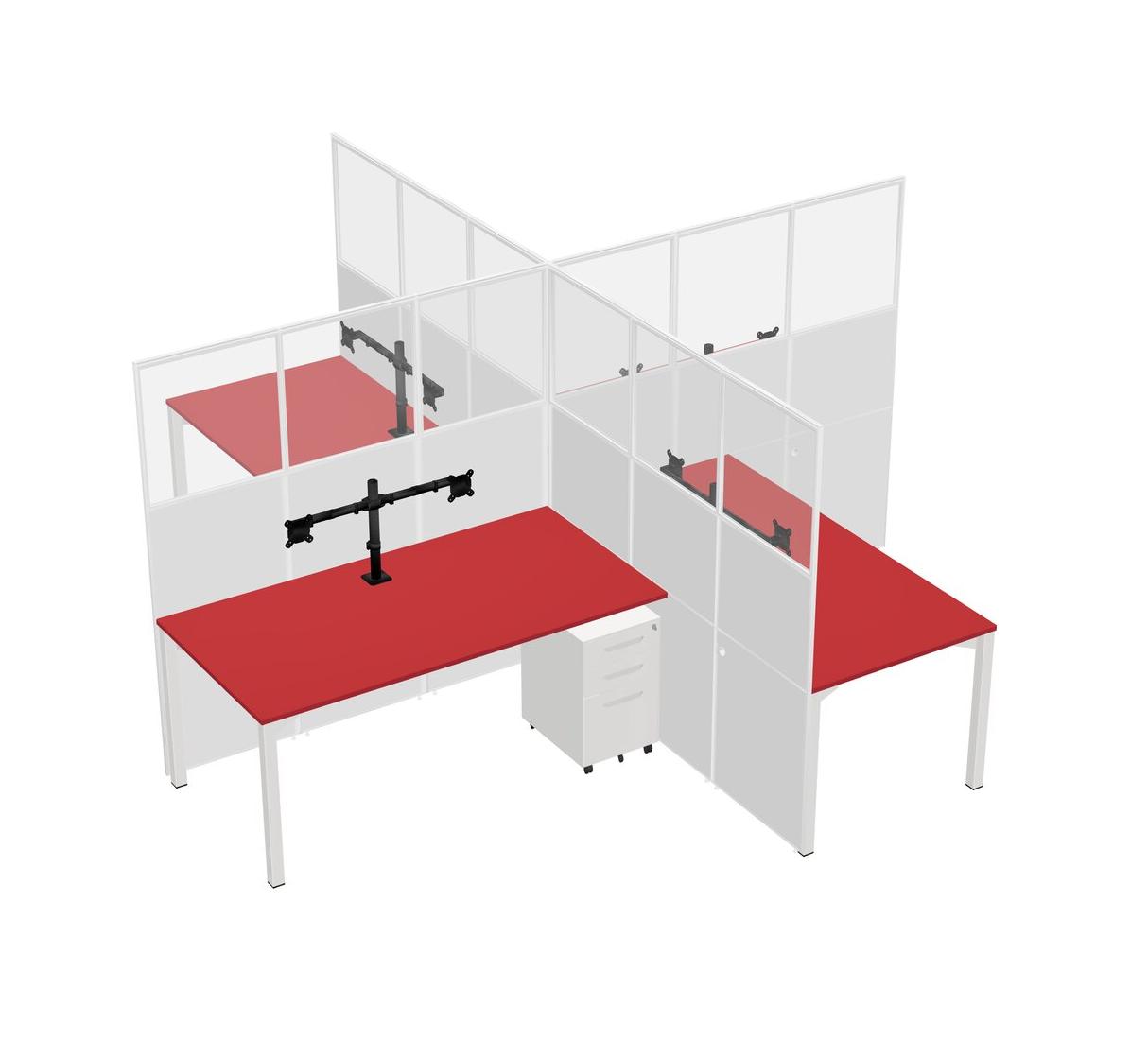 Prism Red Quad Cubicle Workstations For 4 + White Metal Mobile Drawers + Monitor Arm (double Arms)