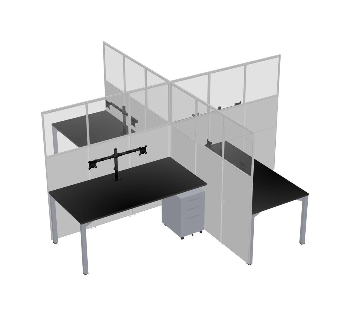 Black Quad Cubicle Workstations For 4 + Grey Metal Mobile Drawers + Monitor Arm (double Arms)