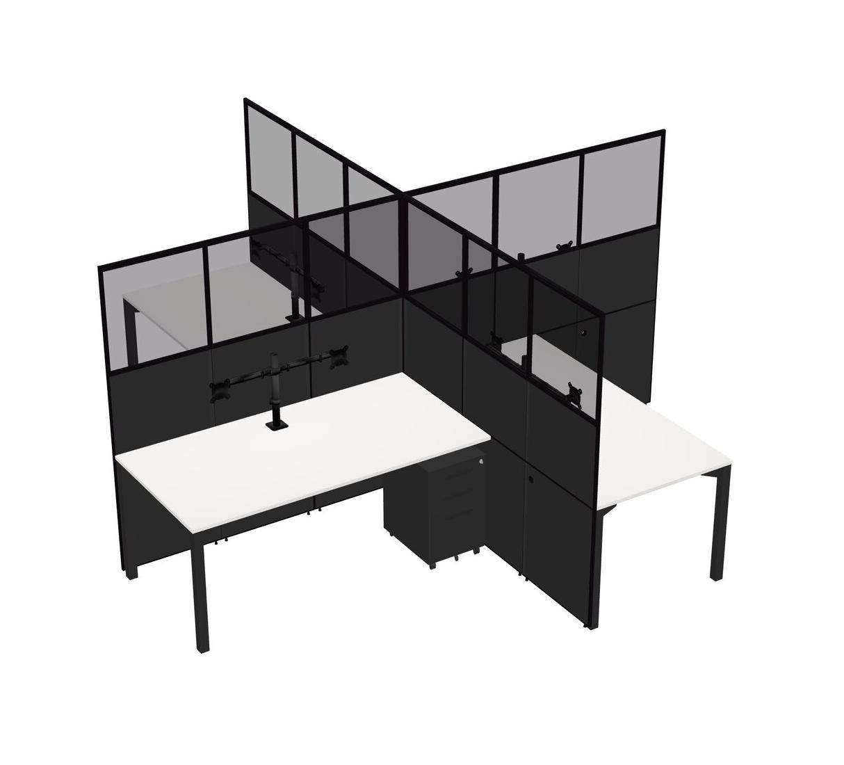 White Quad Cubicle Workstations For 4 + Black Metal Mobile Drawers + Monitor Arm (double Arms)