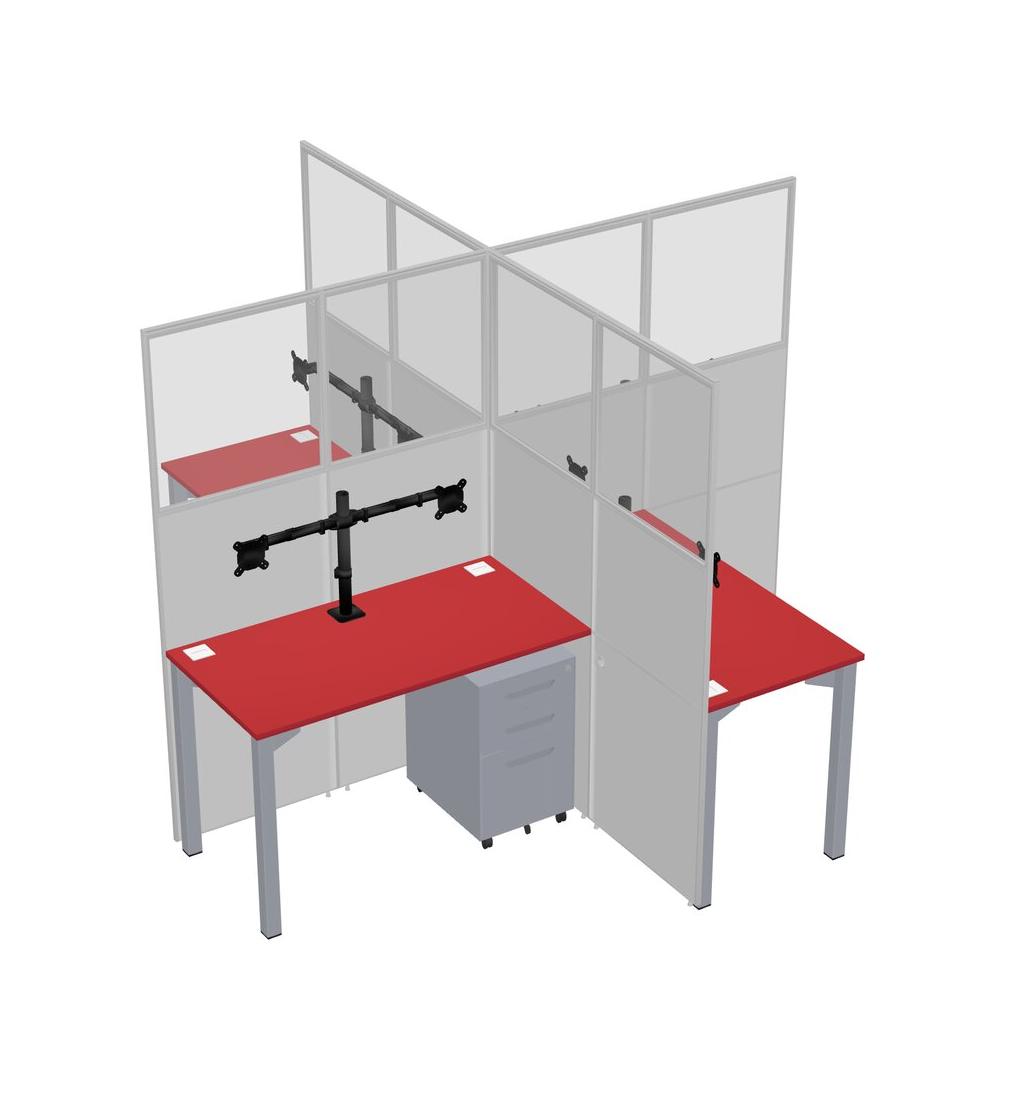 Prism Red Quad Cubicle Workstations For 4 + Grey Metal Mobile Drawers + Monitor Arm (double Arms)
