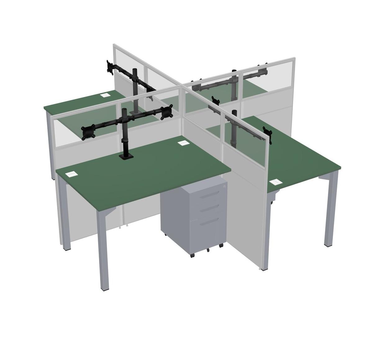 Green Quad Cubicle Workstations For 4 + Grey Metal Mobile Drawers + Monitor Arm (double Arms)