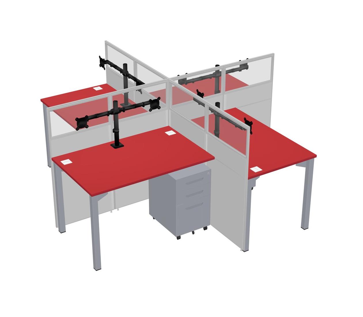 Prism Red Quad Cubicle Workstations For 4 + Grey Metal Mobile Drawers + Monitor Arm (double Arms)