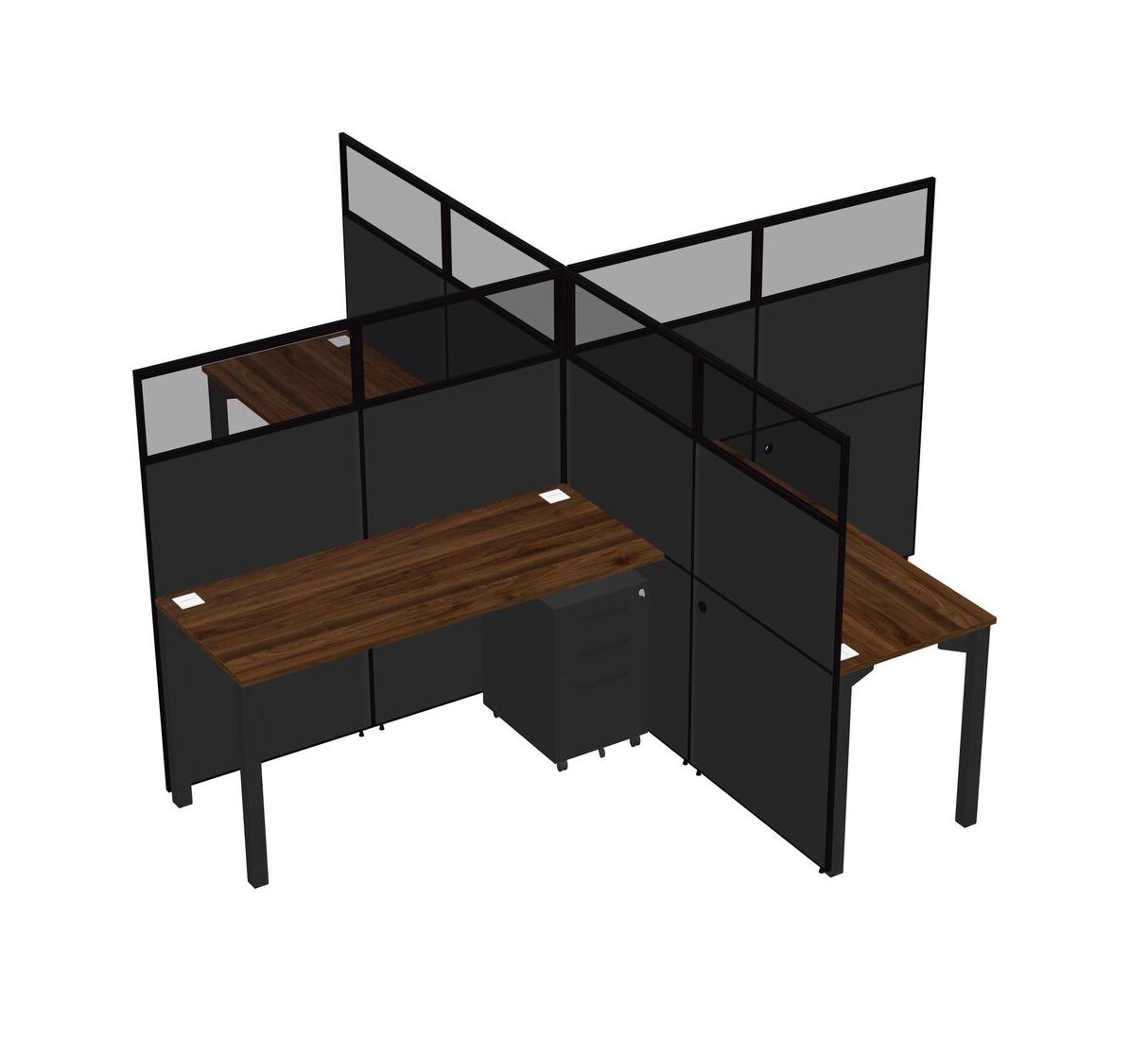 Columbia Walnut Quad Cubicle Workstations For 4 + Black Metal Mobile Drawers