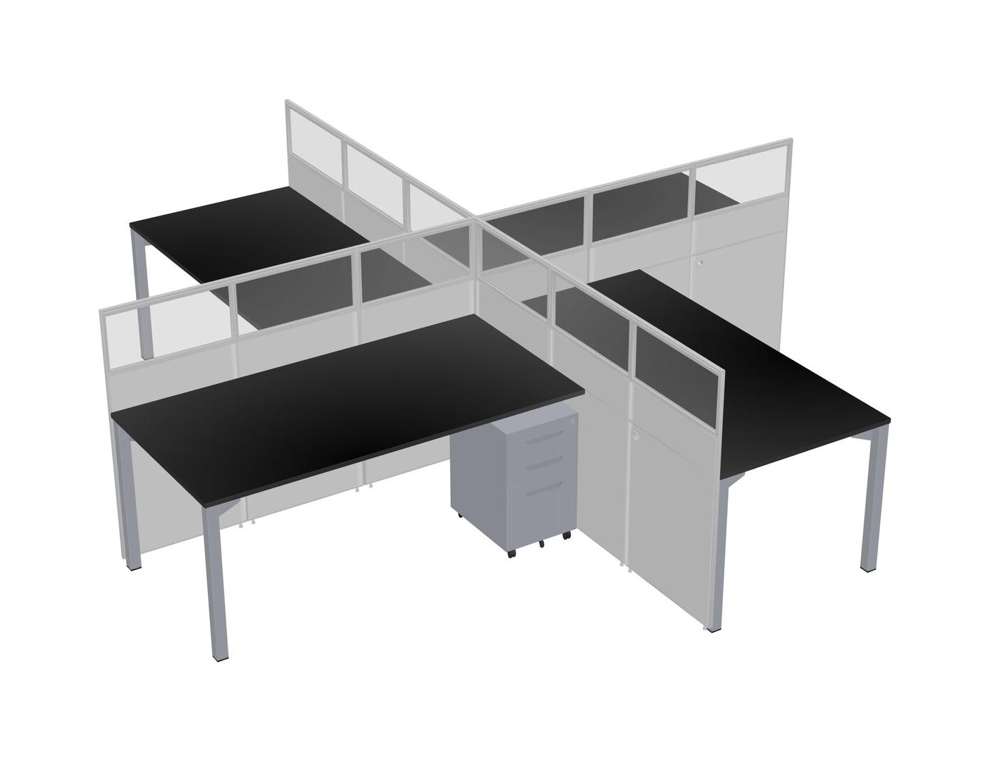 Black Quad Cubicle Workstations For 4 + Grey Metal Mobile Drawers
