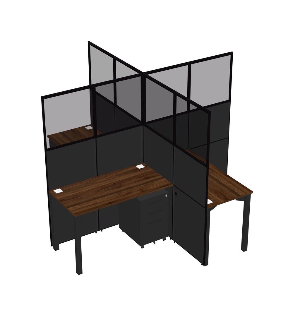 Columbia Walnut Quad Cubicle Workstations For 4 + Black Metal Mobile Drawers