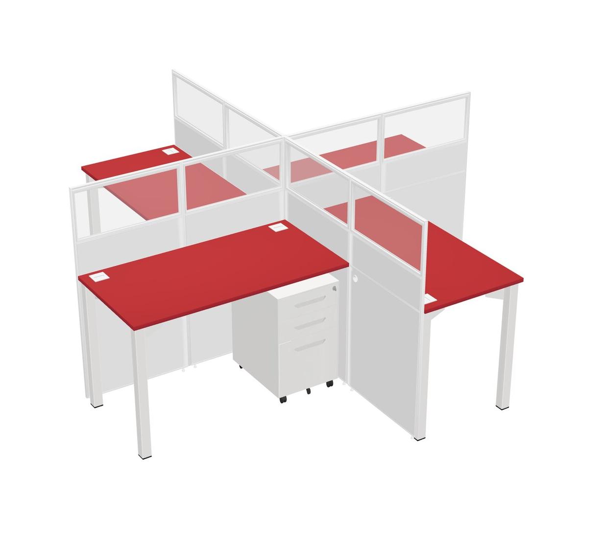 Prism Red Quad Cubicle Workstations For 4 + White Metal Mobile Drawers