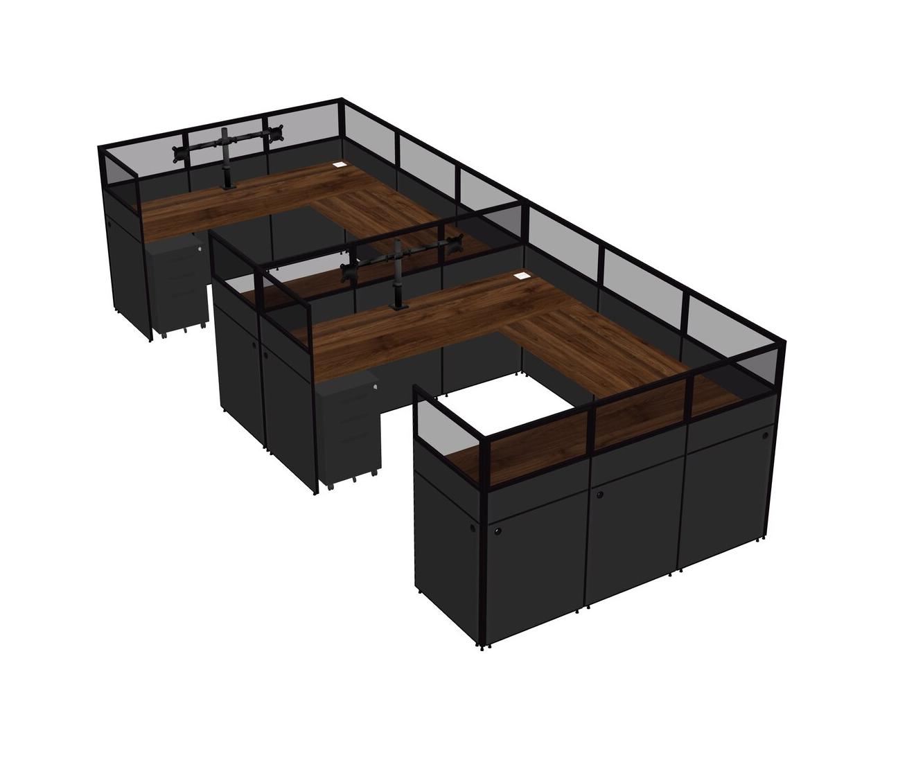 Système De Panneaux En U En Noyer Columbia Pour 2 Personnes + Bras D'écran (bras Doubles) + Tiroirs Mobiles En Métal Pour 2 Utilisateurs