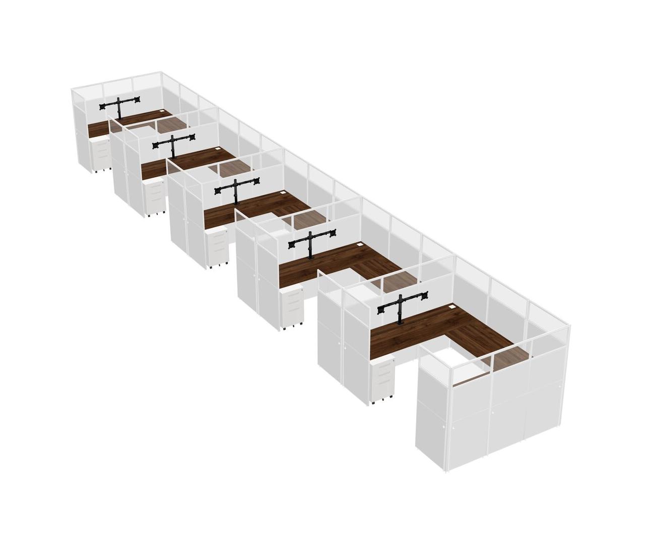 Système De Panneaux En U En Noyer Columbia Pour 5 Personnes + Bras D'écran (bras Doubles) + Tiroirs Mobiles En Métal Pour 5 Utilisateur(s)