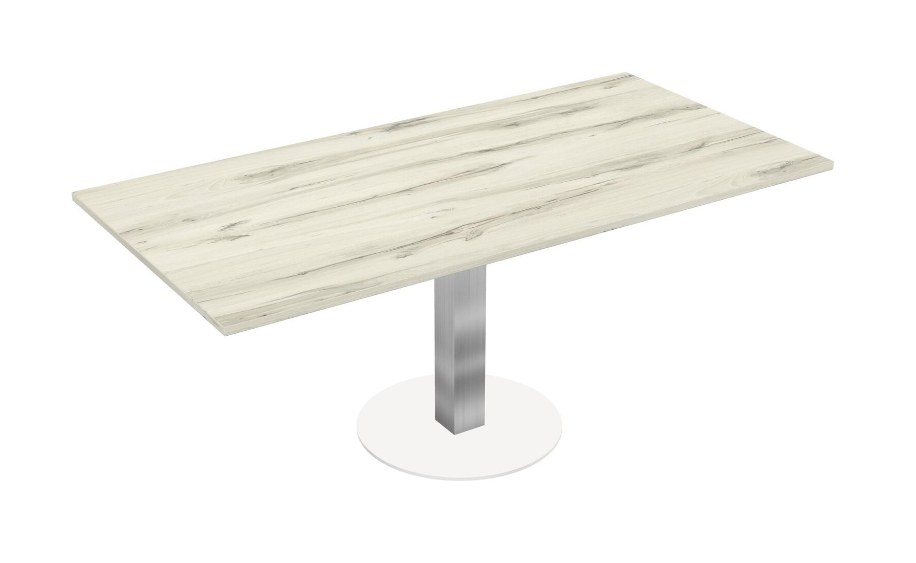 Table Modulaire Pour Bureau, Restaurant, Cafétéria, Salle De Pause Et Service De Restauration, Avec Plateau En Bois Heinne Holz, Pieds Carrés Chromés Et Base Ronde Blanche