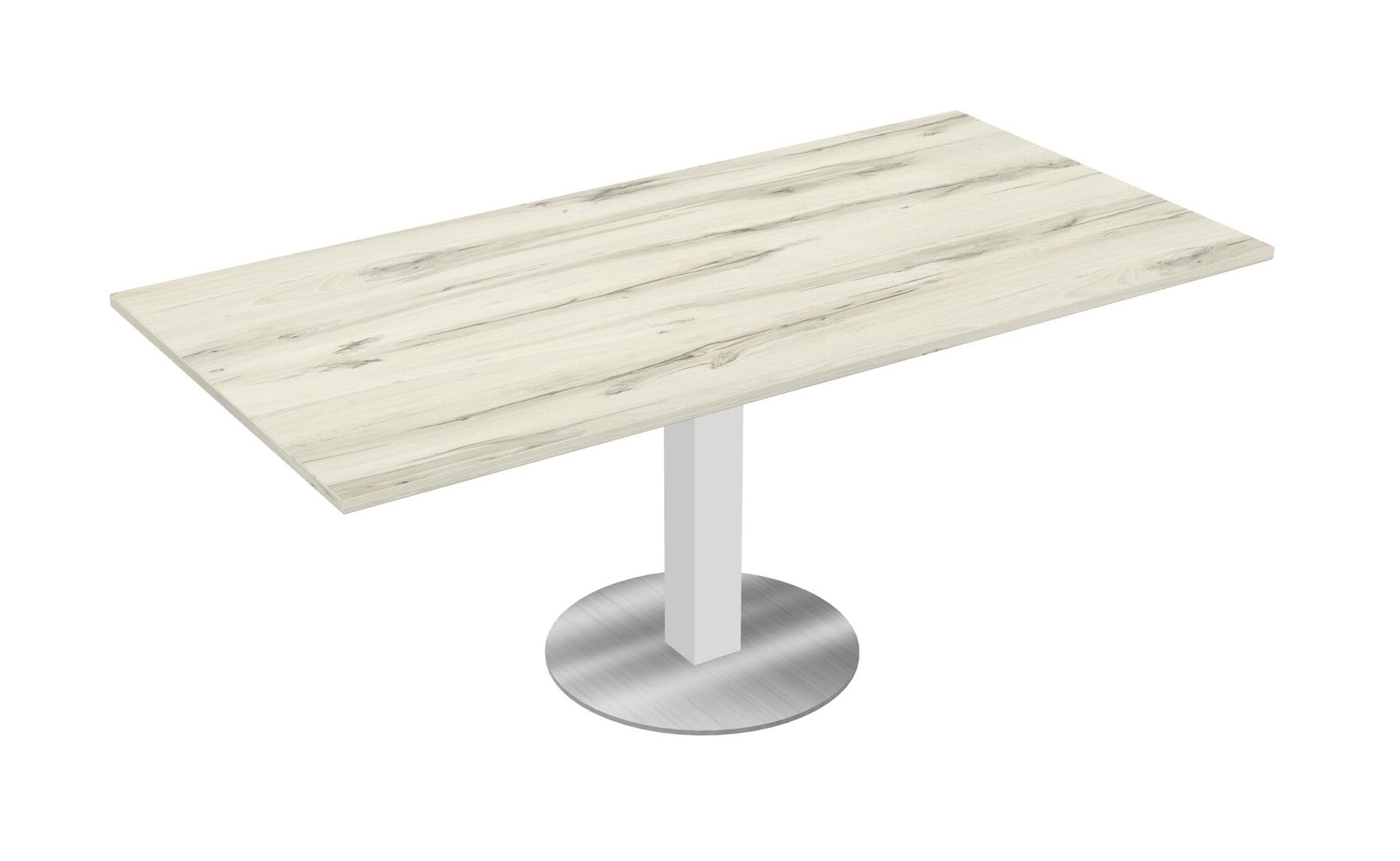 Table Modulaire Pour Bureau, Restaurant, Cafétéria, Salle De Pause Et Service De Restauration, Avec Plateau En Bois Heinne Holz, Pieds Carrés Blancs Et Base Ronde Chromée