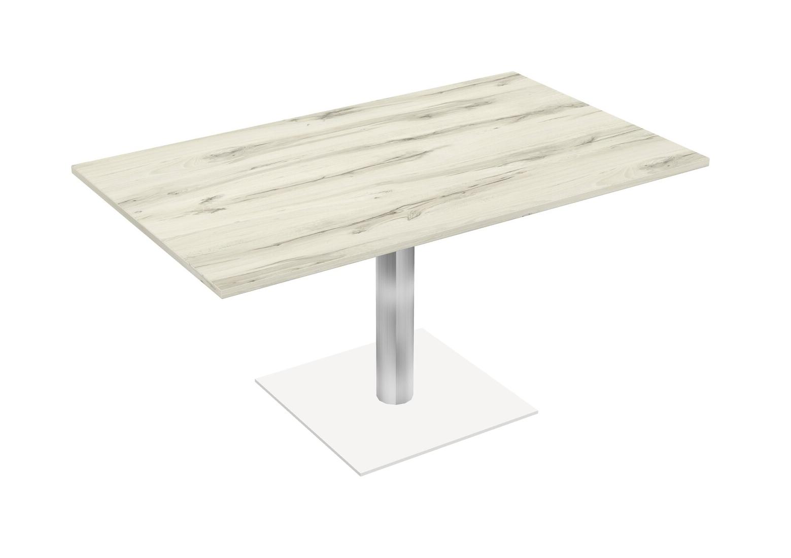 Table Modulaire Pour Bureau, Restaurant, Cafétéria, Salle De Pause Et Service De Restauration, Avec Plateau En Bois Heinne Holz, Pieds Ronds Chromés Et Base Carrée Blanche