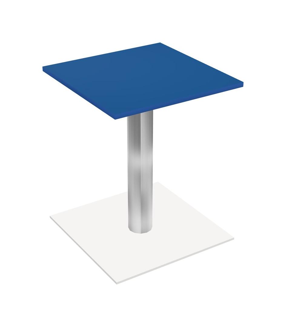 Table Modulaire Pour Bureau, Restaurant, Cafétéria, Salle De Pause Et Service De Restauration, Avec Plateau Bleu Prismatique, Pieds Ronds Chromés Et Base Carrée Blanche