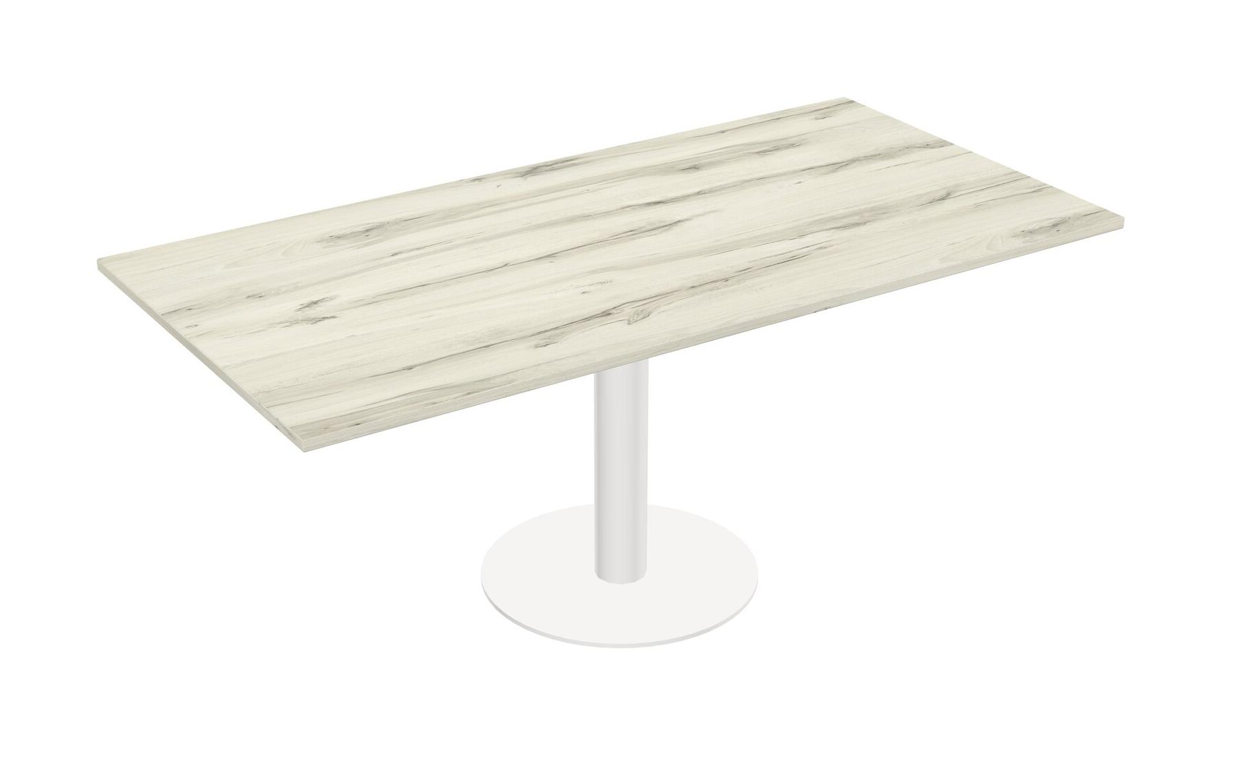 Table Modulaire Pour Bureau, Restaurant, Cafétéria, Salle De Pause Et Service De Restauration, Avec Plateau En Bois Heinne Holz, Pieds Ronds Blancs Et Plaque De Base Ronde Blanche
