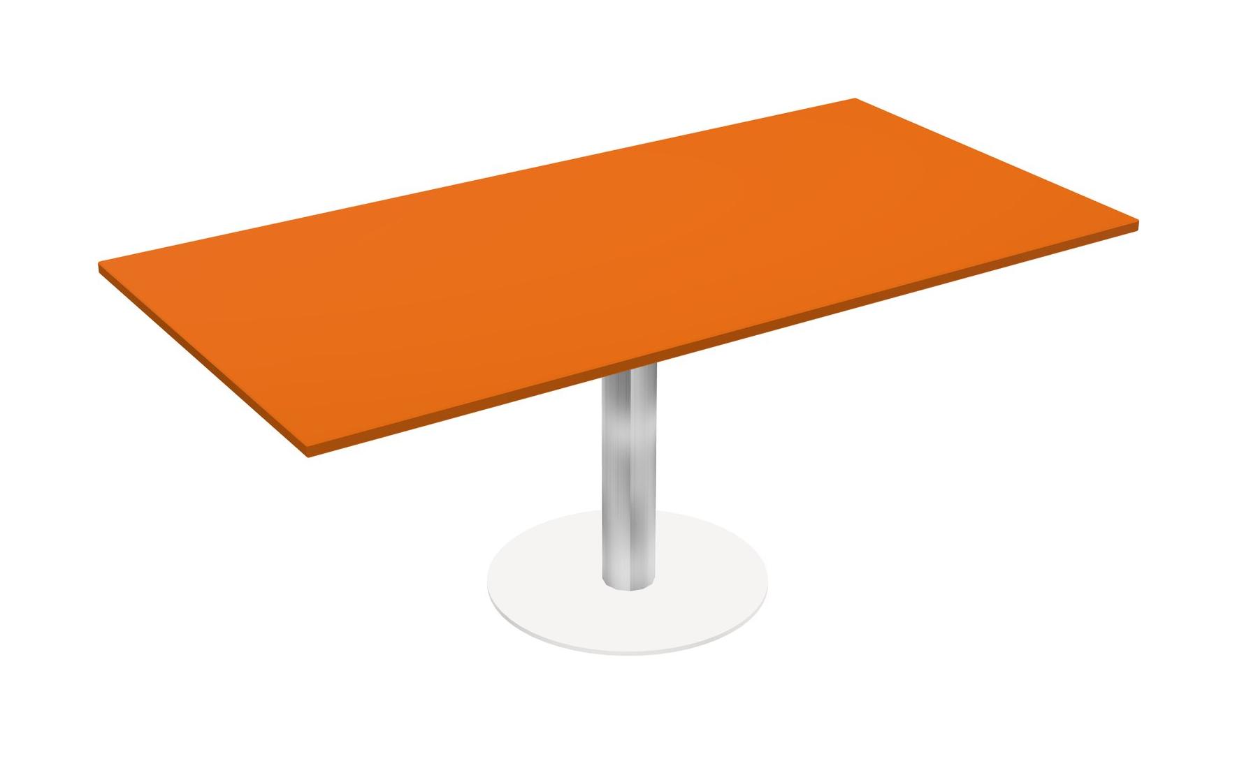 Table Modulaire Pour Bureau, Restaurant, Cafétéria, Salle De Pause Et Service De Restauration, Avec Plateau Orange, Pieds Ronds Chromés Et Base Ronde Blanche