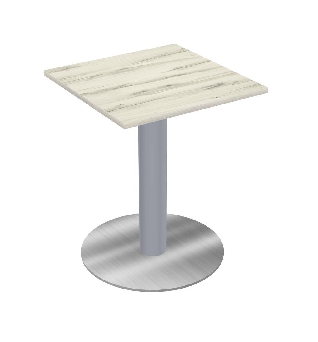 Table Modulaire Pour Bureau, Restaurant, Cafétéria, Salle De Pause Et Service De Restauration, Avec Plateau En Bois Heinne Holz, Pieds Ronds Gris Et Plaque De Base Ronde Chromée