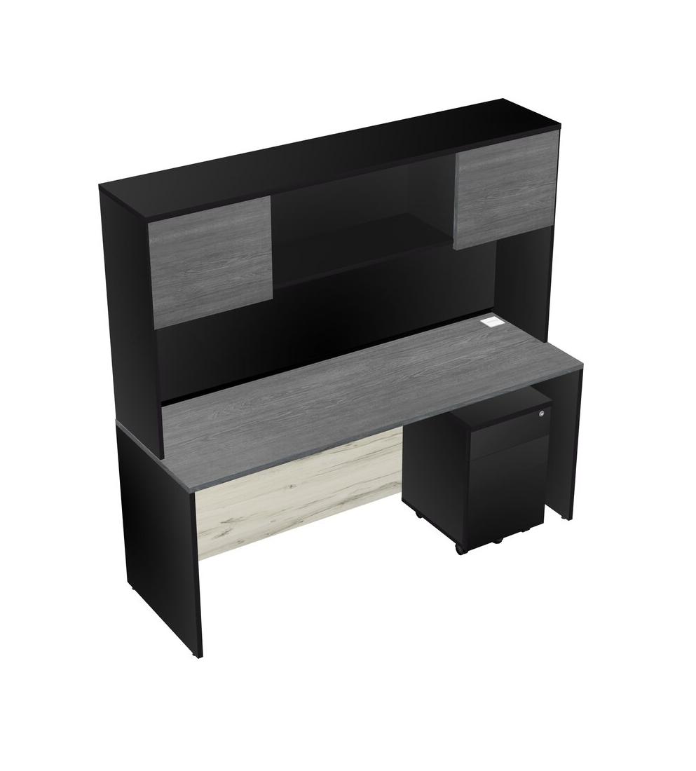 Grey Rectangular Office Desk Plus Black Wooden Mobile Drawers And Black Hutch