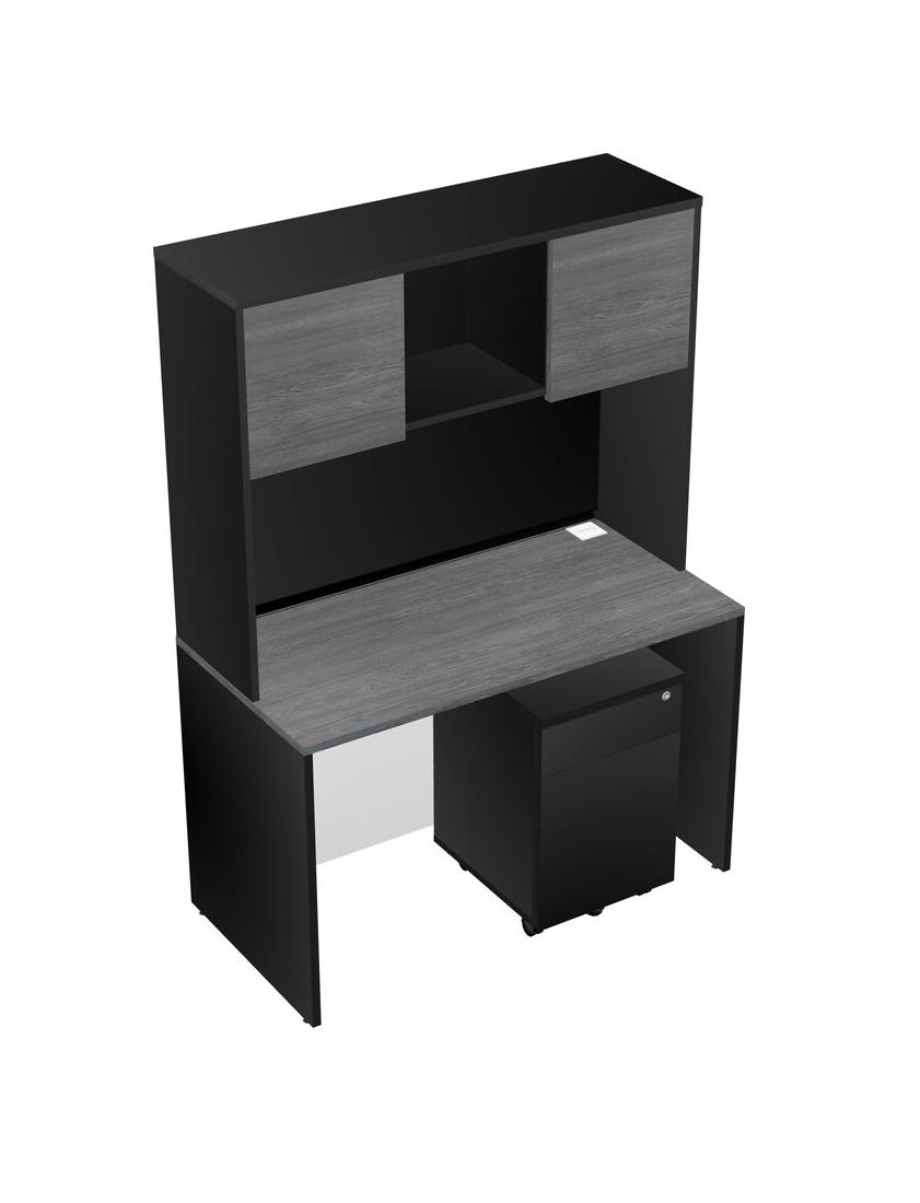 Grey Rectangular Office Desk Plus Black Wooden Mobile Drawers And Black Hutch