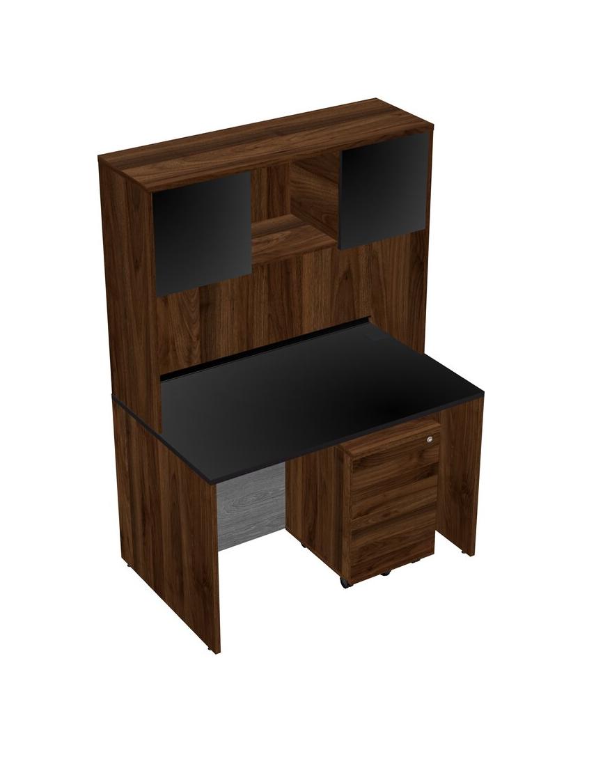 Black Rectangular Office Desk Plus Columbia Walnut Wooden Mobile Drawers And Columbia Walnut Hutch