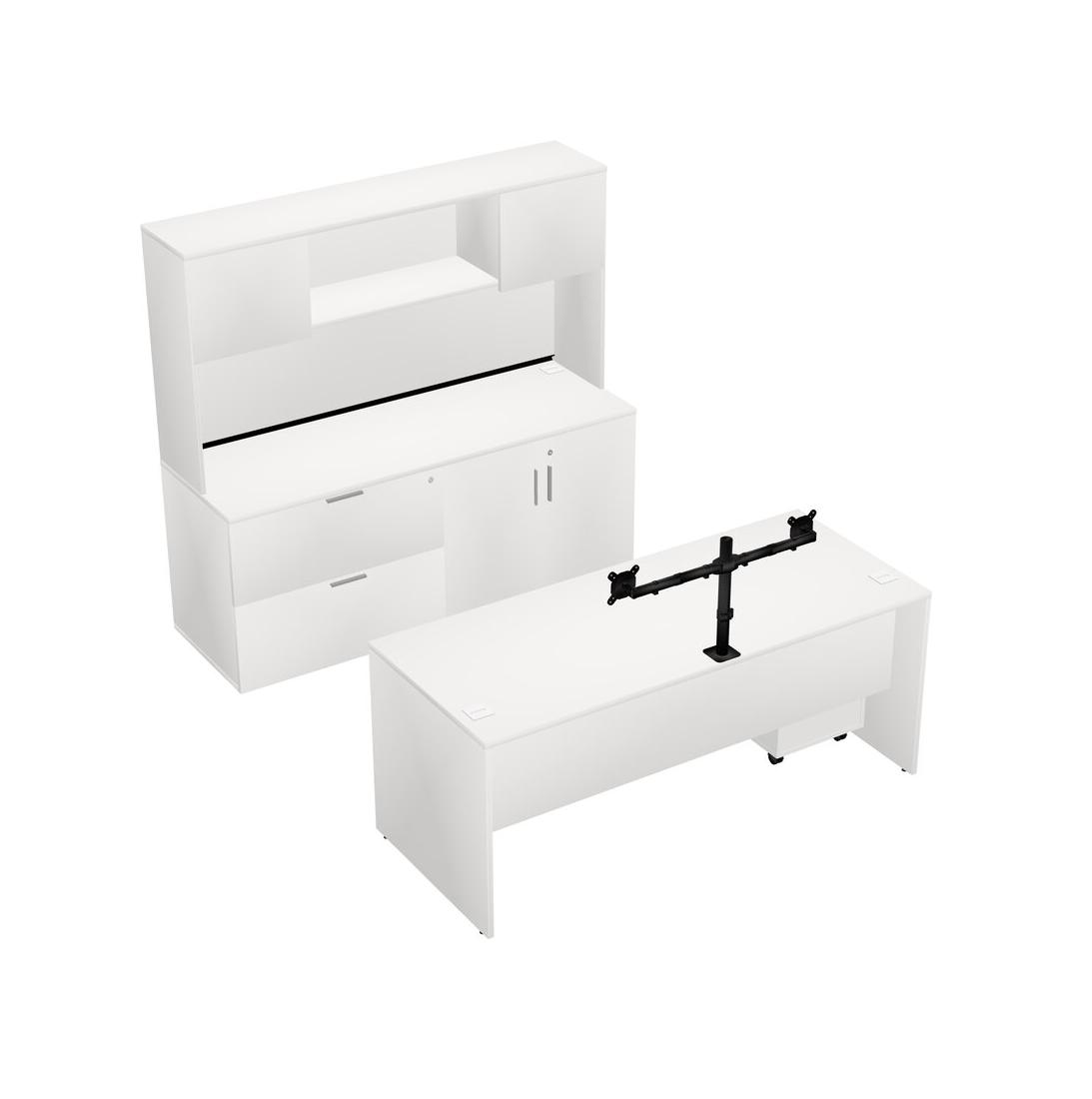 Bureau Parallèle Blanc Avec Rangement Latéral Combiné + Tiroirs Mobiles En Bois + Clapier + Bras D'écran (bras Doubles)