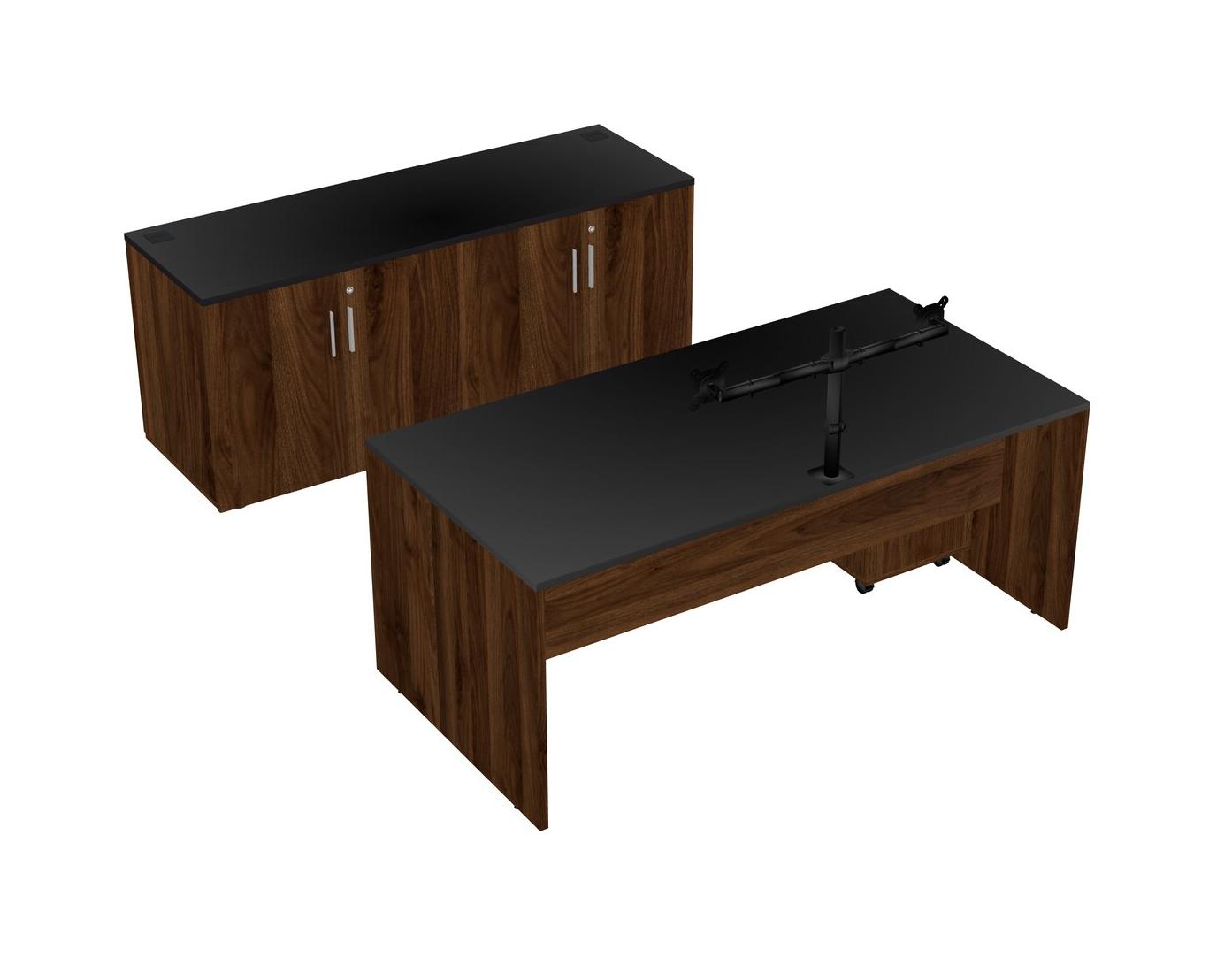 Bureau Parallèle Noir Avec Armoire De Rangement, Tiroirs Mobiles En Bois Et Bras D'écran (bras Doubles)