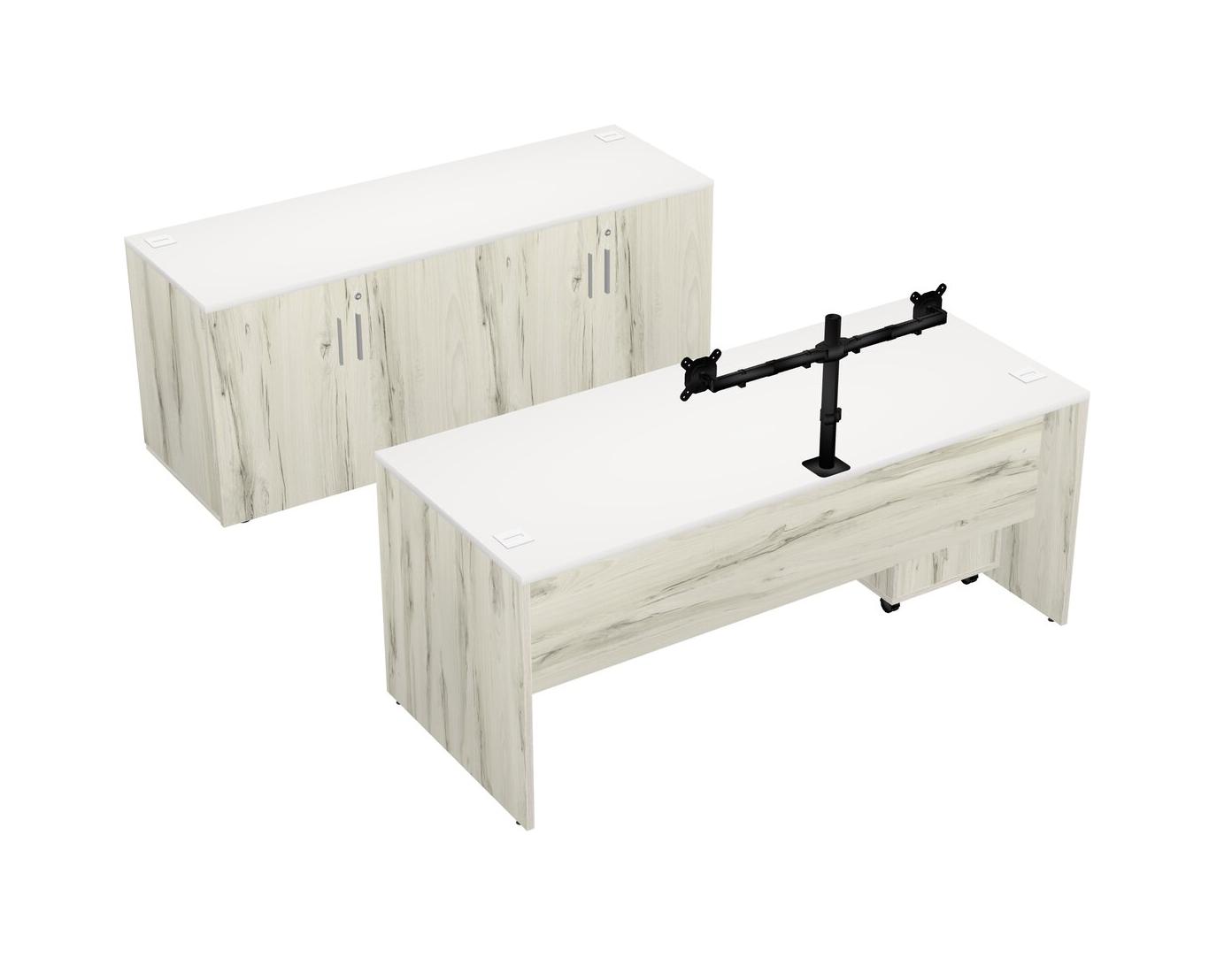 Bureau Parallèle Blanc Avec Armoire De Rangement, Tiroirs Mobiles En Bois Et Bras D'écran (bras Doubles)
