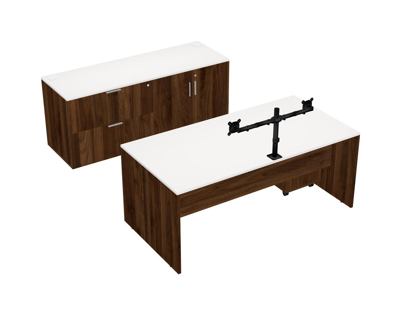 Bureau Parallèle Blanc Avec Rangement Latéral Combiné + Tiroirs Mobiles En Bois + Bras D'écran (bras Doubles)