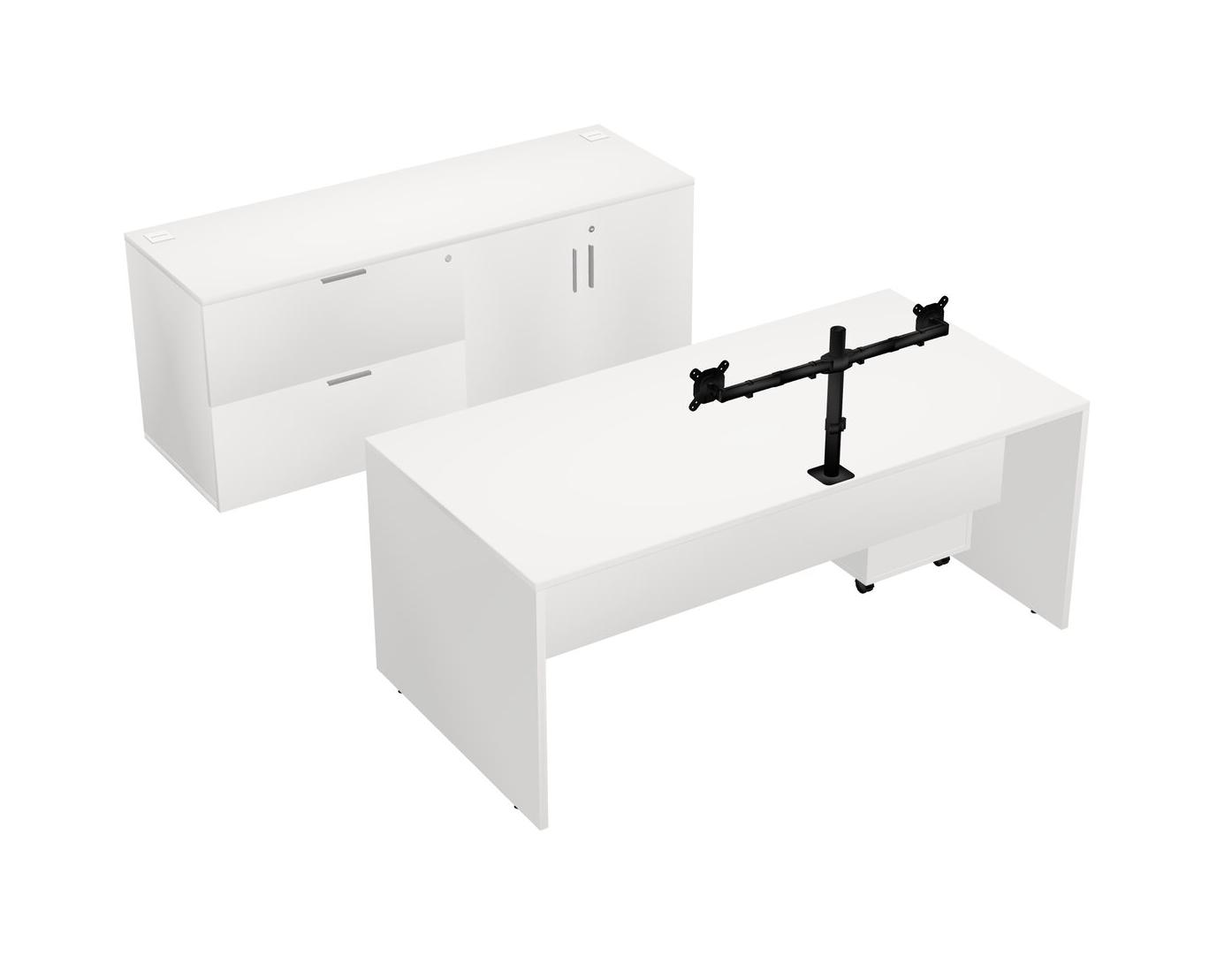 Bureau Parallèle Blanc Avec Rangement Latéral Combiné + Tiroirs Mobiles En Bois + Bras D'écran (bras Doubles)