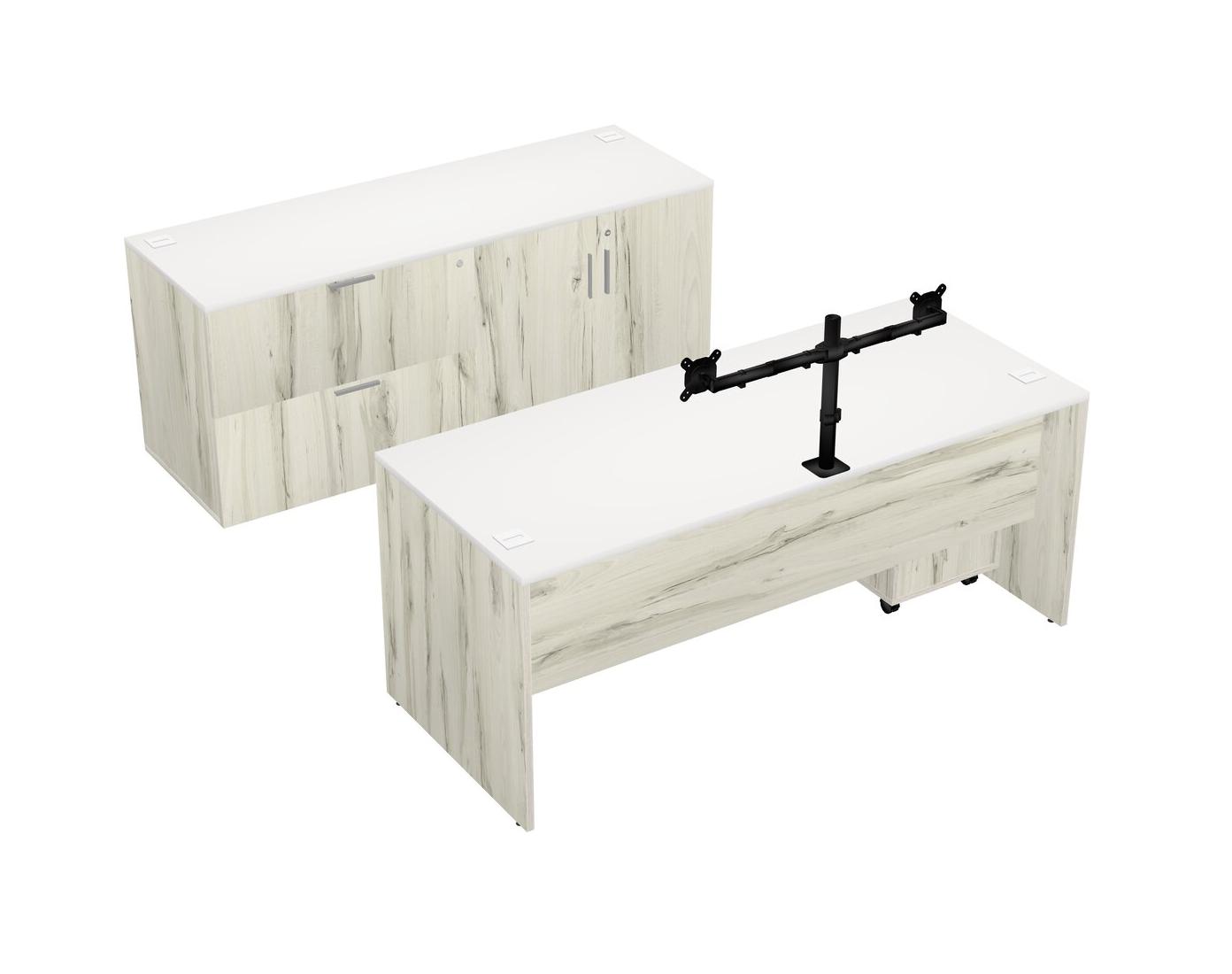 Bureau Parallèle Blanc Avec Rangement Latéral Combiné + Tiroirs Mobiles En Bois + Bras D'écran (bras Doubles)